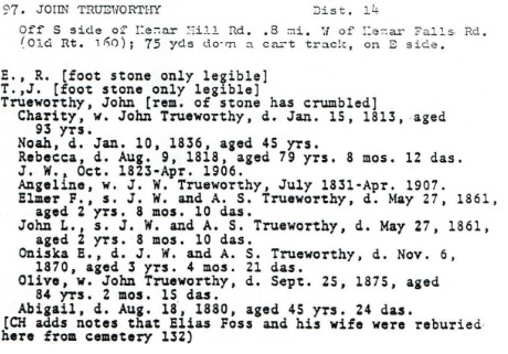John Treworgy/Trueworthy died November 25, 1832 at the age of 93 and is buried in the Trueworthy Cemetery alongside his wife, Charity Emery Trueworthy who also lived a long life, dying in 1843 at the age of 92.